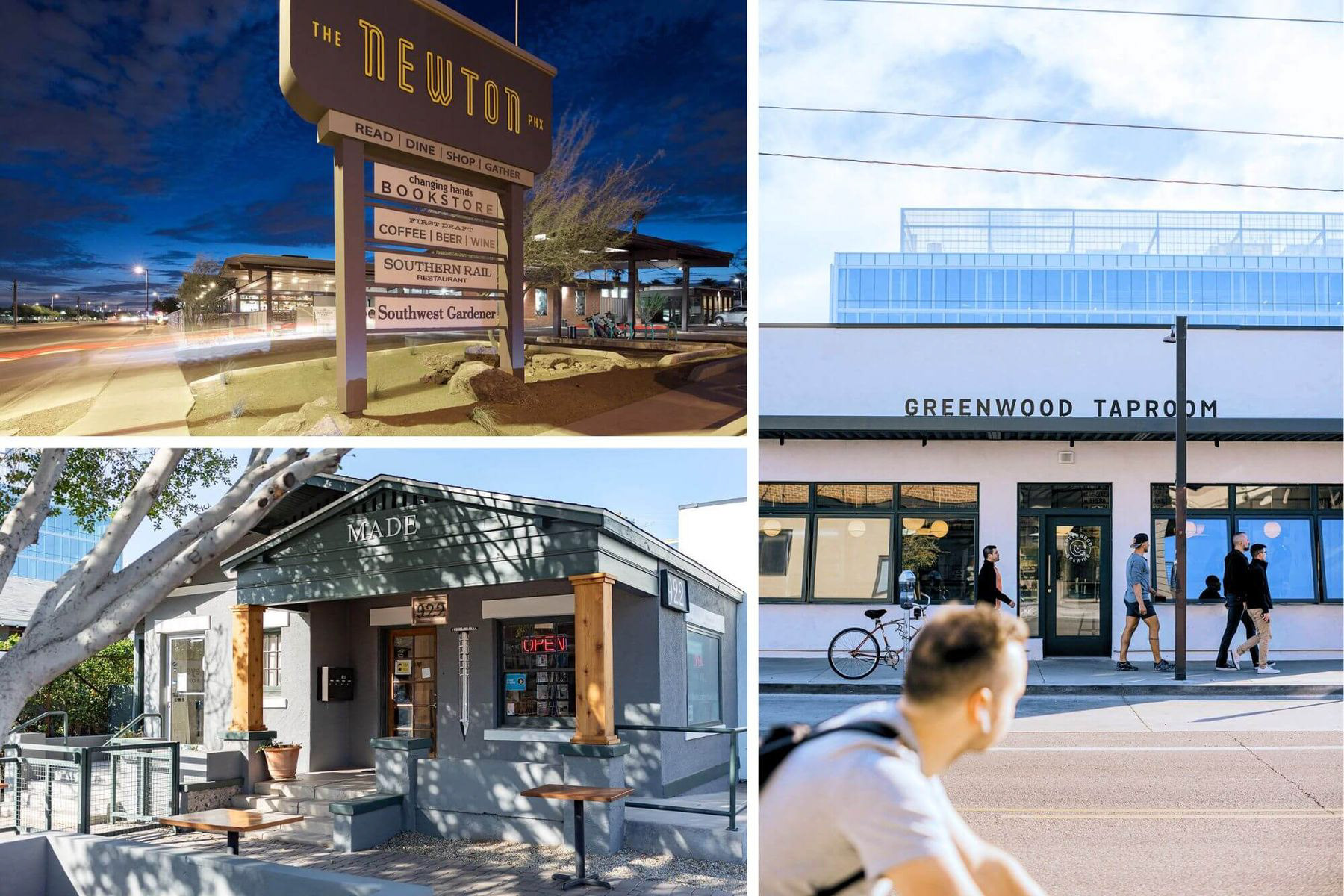 Today, the City of Phoenix’s adaptive reuse program is citywide and allows for buildings up to 25,000 square feet to be repurposed. Notable examples include Changing Hands & First Draft Book Bar, MADE Art Boutique, and Greenwood Brewing. (Photos: Andrew Pielage/Venue Projects, Cindy Dach, and Greenwood Brewing)