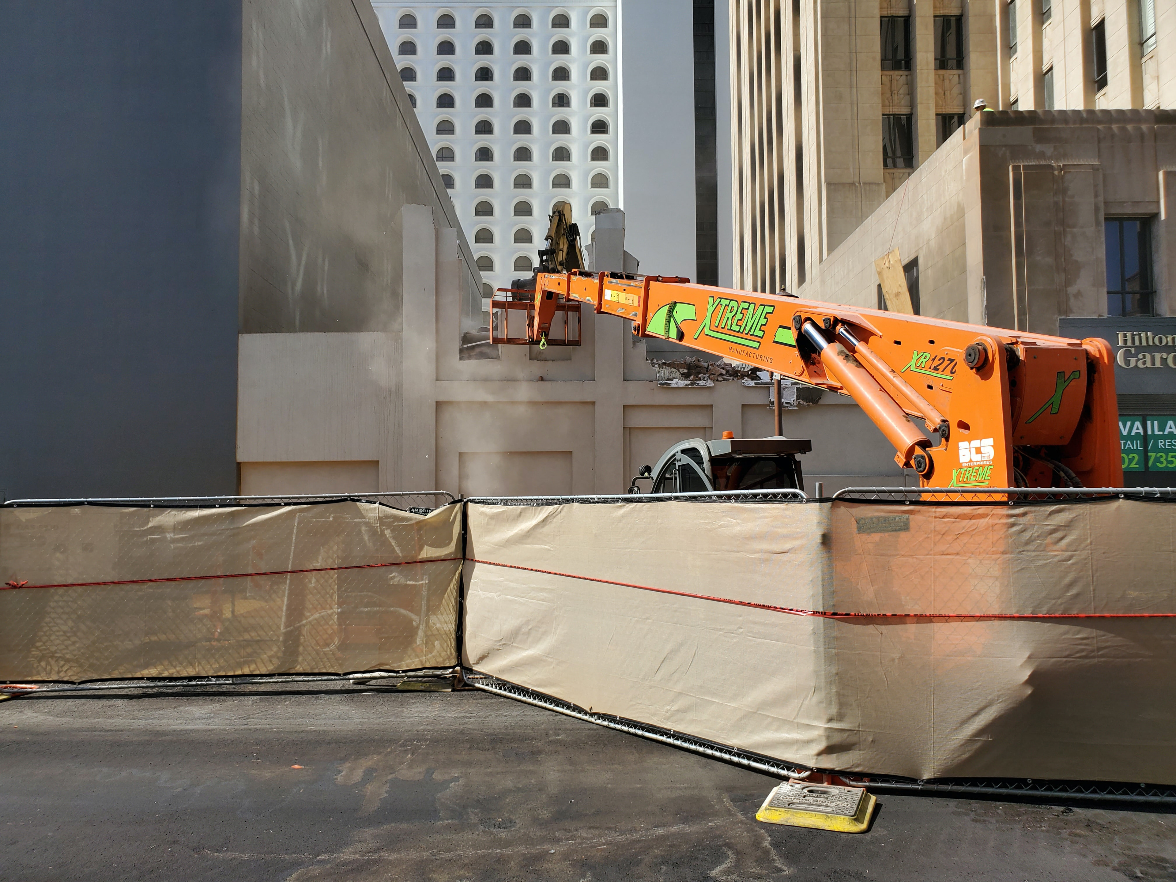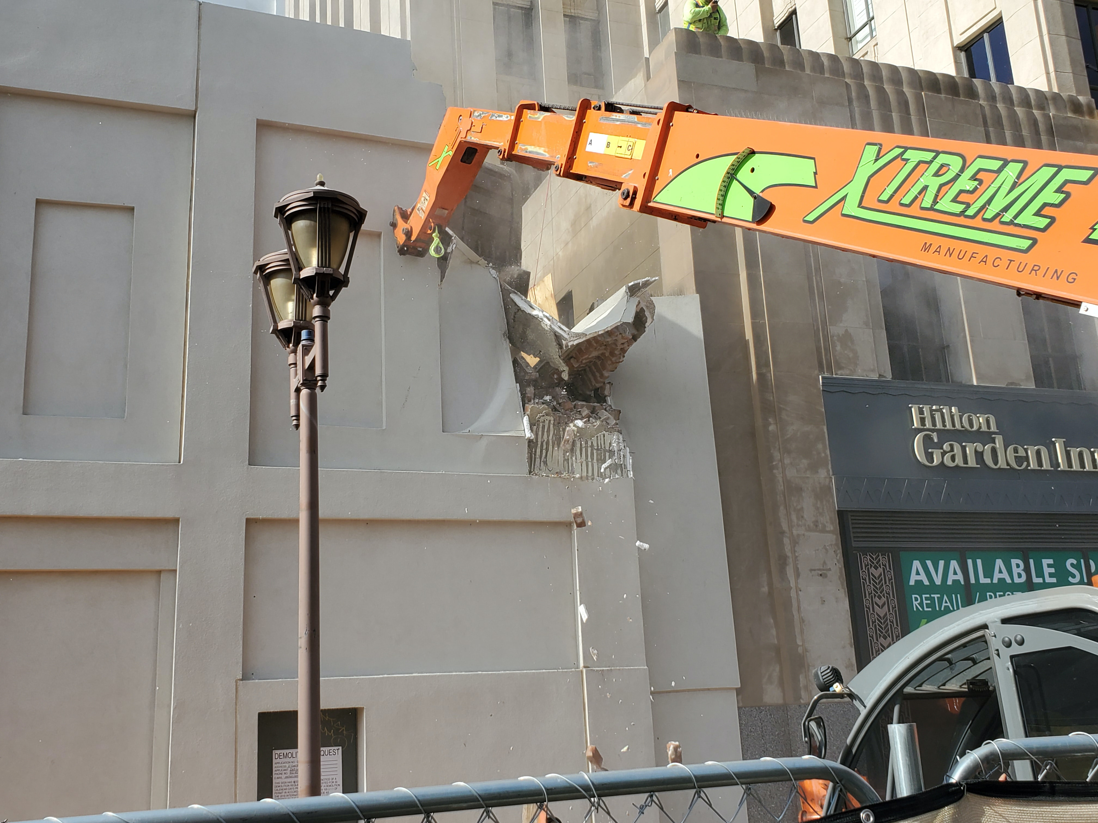 The lynchpin of its destruction began in 2008 when the lodge and its roof were significantly damaged by construction workers renovating the neighboring Art Deco style Professional Building, rehabilitating it as the Hilton Garden Inn.